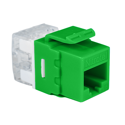 Las Jacks Keystone Cat6e de Nitrotel ofrecen una interconexión excepcional en aplicaciones 10/100/1000 Base-T Fast y Gigabit Ethernet. Estos conectores trapezoidales con clasificación de componentes funcionan junto con cables, núcleos y paneles de alta velocidad para proporcionar un rendimiento más allá de los estándares de categoría 6 propuestos. Su diseño compacto les permite encajar en cualquier placa frontal convencional, caja de salida o panel. Verde.