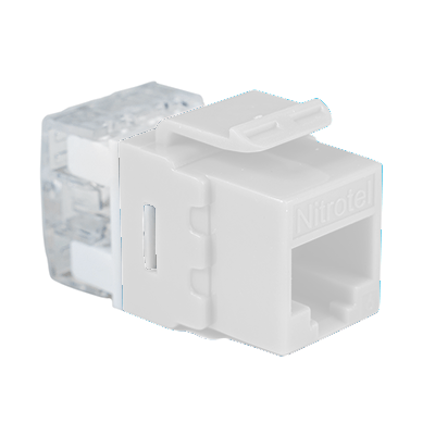 Las Jacks Keystone Cat6e de Nitrotel ofrecen una interconexión excepcional en aplicaciones 10/100/1000 Base-T Fast y Gigabit Ethernet. Estos conectores trapezoidales con clasificación de componentes funcionan junto con cables, núcleos y paneles de alta velocidad para proporcionar un rendimiento más allá de los estándares de categoría 6 propuestos. Su diseño compacto les permite encajar en cualquier placa frontal convencional, caja de salida o panel. Blanco.
