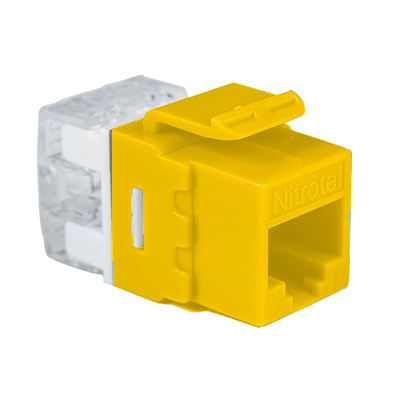 Las Jacks Keystone Cat6e de Nitrotel ofrecen una interconexión excepcional en aplicaciones 10/100/1000 Base-T Fast y Gigabit Ethernet. Estos conectores trapezoidales con clasificación de componentes funcionan junto con cables, núcleos y paneles de alta velocidad para proporcionar un rendimiento más allá de los estándares de categoría 6 propuestos. Su diseño compacto les permite encajar en cualquier placa frontal convencional, caja de salida o panel. Amarillo.