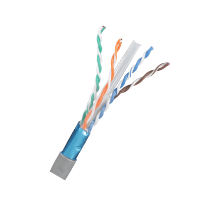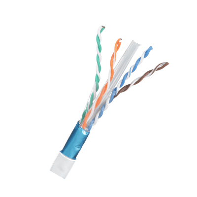 El cable de cobre TX6A™ de categoría 6A U/UTP está fabricado con conductores de cobre 23 AWG con aislamiento de polietileno de alta densidad. Los conductores de cobre están retorcidos en pares y separados por un divisor en forma de cruz. Los cuatro pares están cubiertos con cinta Vari-MaTriX y Jacket (chaqueta) de PVC retardante de llama. El cable azul conductor vertical (CMR) viene con 1000 ft (305 m) en un carrete.