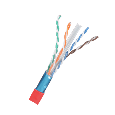 El cable de cobre TX6A™ de categoría 6A U/UTP está fabricado con conductores de cobre 23 AWG con aislamiento de polietileno de alta densidad. Los conductores de cobre están retorcidos en pares y separados por un divisor en forma de cruz. Los cuatro pares están cubiertos con cinta Vari-MaTriX y Jacket (chaqueta) de PVC retardante de llama. El cable rojo conductor vertical (CMR) viene con 1000 ft (305 m) en un carrete.